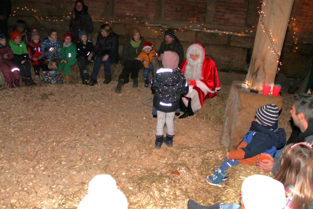 Wie schon üblich in Schlewecke, hatte der Ortsrat wieder alle Kinder unter 6 Jahren und deren ältere Geschwister zum Treffen mit dem Nikolaus am 6.12 um 16 Uhr eingeladen. Das Treffen war in diesem Jahr in der Scheune der Familie Klingemann. Hierfür gab es vorher ein persönliches Anschreiben mit dem die Kinder angemeldet werden konnten. Bei der Anmeldung mußte für jedes teilnehmende Kind ein kleiner Obolus entrichtet werden. Auch Kinder aus anderen Orten die durch Großeltern oder andere Verwandte einen Bezug zu Schlewecke haben konnten angemeldet werden. Mit über 30 Anmeldungen war die Resonanz sehr gut. Die Kinder konnten auf bereitgestellten Strohballen Platz nehmen. Die Scheune war mit mehreren Lichterketten und anderen Deko Gegenständen sehr schön hergerichtet worden. Bevor der Nikolaus kam hat die Ortsbürgermeisterin den Kindern eine Geschichte vom Nikolaus erzählt, dann wurden vorweihnachtliche Lieder gesungen. Nun war die Spannung aber doch schon recht groß wann der Nikolaus erscheint. Endlich war es soweit, der Nikolaus stampfte durch die Scheune und nahm mitten unter den Kindern auch auf einem Strohballen Platz, den Sack mit den Gaben hatte er neben sich abgelegt. Nun erzählte er erst einmal wo er herkommt und wie er den Weg nach Schlewecke geschafft hat. Mehrere Kinder haben dann ihre Wünsche für Weihnachten – oder ein kleines Gedicht vorgetragen. Nun nahm der Nikolaus für jedes Kind ein kleines Geschenk aus dem Gabensack. Als alles verteilt war, verabschiedete sich der Nikolaus wieder, da er ja noch andere Kinder aufsuchen mußte. Auch für Getränke war gesorgt für die Kinder Kakao und für die Erwachsenen Glühwein, hierfür konnte eine kleine Spende geleistet werden. So ging für alle Anwesenden eine schöne Begegnung zu Ende. Nun hoffen wir das auch im nächsten Jahr der Nikolaus wieder den Weg nach Schlewecke findet.