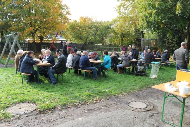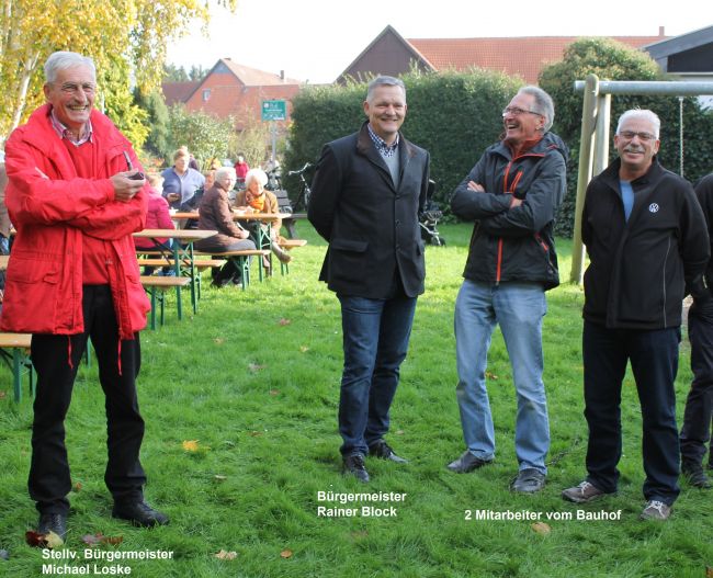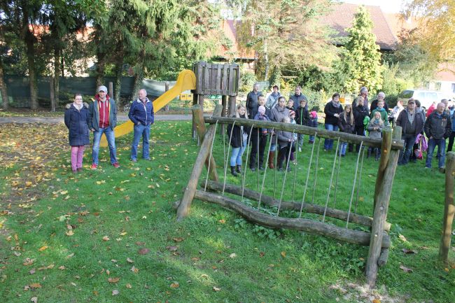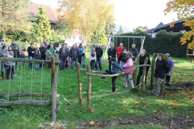 Da die stellvertretende Ortsbürgermeisterin Ulrike Schumann die Planungen von Anfang an geleitet hat, übernahm Sie auch die Einweihungsfeier. Sie konnte bei sonnigem Wetter aus der Verwaltung der Stadt Bockenem den Bürgermeister Rainer Block und seinen Stellvertreter Michale Loske sowie 3 Mitarbeiter vom Bauhof begrüßen, die den Aufbau fachlich begleitet haben. Auch aus dem Ort hatte sich eine ganze Reihe von Bürgern eingefunden, sodass die 50 Portionen Erbsensuppe mit Würstchen auch verkauft werden konnten. Zu der ersten Fahrt mit dieser Seilbahn hatten sich die Kinder dann auch bereits angestellt und so konnte die erste Fahrt beginnen, nach dem die bis dahin angeschlossene Rolle mit Sitz freigegeben wurde.