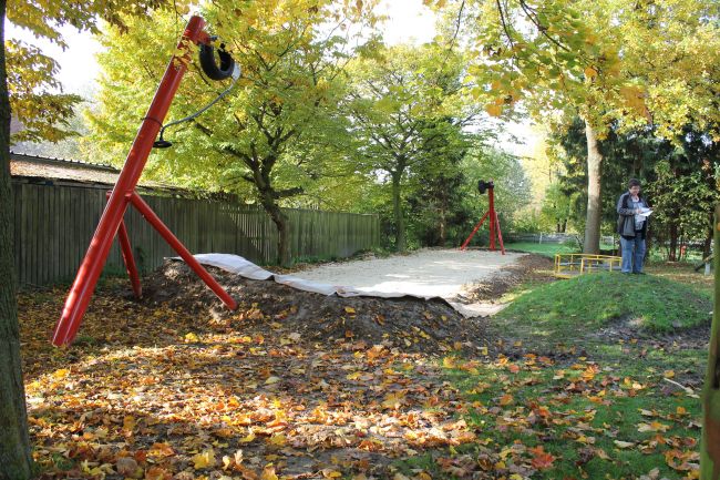 Man stellte aber fest dass der Betrag für das Gerät noch nicht ausreicht, und so wurde beschlossen die Überschüsse aus den nächsten Veranstaltungen im Ort ebenfalls hierfür zu verwenden. Weiterhin bat man die Schlewecker ansässigen Firmen um eine Spende, die dieser Bitte auch entsprachen. Ende letzten Jahres war es dann soweit die Seilbahn konnte beschafft werden, die dann im Winter auch geliefert – und im Feuerwehrhaus zwischen gelagert wurde. Sie sollte dann im Frühjahr aufgebaut werden. Durch die Vorbereitungen zum Feuerwehrfest und andere Terminüberschneidungen konnte erst im August mit dem Aufbau begonnen werden. Bei dem ersten Termin hierfür stellte man fest dass die vorgesehene Stelle auf dem Spielplatz in der Teichrinne nicht geeignet war für dieses Gerät, da das Gelände ein zu großes Gefälle dafür hat. Nun musste ein neuer Ort auf diesem Platz gefunden werden. Danach konnten die Erdarbeiten beginnen. Im nächsten Schritt mussten die Stahlstützen aufgebaut – und ausgerichtet werden. Bei dem dann folgendem Arbeitseinsatz wurden die großen Erdlöcher mit Fertigbeton ausgegossen. Rings um die Anlage musste dann ein Erdwall aufgeschüttet werden, anschließend wurden 40 Tonnen weißer Sand aus Bodenstein geholt und mit dem Traktor in das Landebecken gefahren und von Hand auf eine Mindesthöhe von 40 cm ausgebreitet. Bei dem Sand ausbreiten haben auch mehrere Kinder tatkräftig geholfen. Nun konnte das Seil angebracht und gespannt werden. Bei weiteren Arbeitseinsätzen wurden noch Erdarbeiten rund um die Anlage nötig. Es gab insgesamt 12 Arbeitseinsätze bis zur Fertigstellung der Anlage, die mit unterschiedlichen Personen aus dem Ort geleistet wurden. Rasen konnte auf den Erdwällen noch nicht eingesät werden, da der Regen in den letzten Tagen dies verhindert hat, daher wurde der Starthügel zur Eiweihung mit Matten abgedeckt. Die Einweihung war für Samstag den 24. Oktober um 11 Uhr festgelegt. Mit einem Flair für jeden Haushalt wurden die Dorfbewohner zur Einweihung eingeladen. Es wurde auch eine Erbsensuppe mit Würstchen und Getränke angeboten.