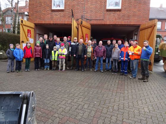 Die Helfer vor dem Zusammenfahren des Osterfeuer vor dem Feuerwehrhaus.  |