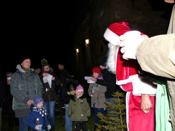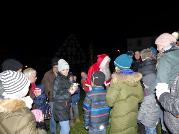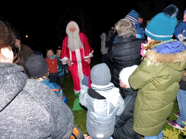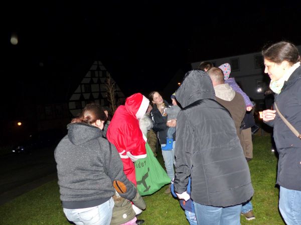 Die erste, vom neu gewählten Ortsrat organisierte Veranstaltung war ein voller Erfolg. Der Einladung des Ortsrats waren 27 Kinder und ihre Eltern und Großeltern am Nikolausabend bei trockenem und nicht allzu kaltem Wetter gefolgt. Mit großen Eifer schmückten sie die Tanne vor der Kirche mit mitgebrachtem Baumschmuck, nachdem alle zusammen einige Weihnachtslieder gesungen hatten. Eine Adventgeschichte wurde auch vorgelesen. Dann warteten alle gespannt auf die Ankunft des Nikolauses. Die Wartezeit wurde mit warmen Getränken, die von den Organisatoren ausgeschenkt wurden, überbrückt. Als der Nikolaus dann endlich kam, leuchteten die Kinderaugen und nachdem einige von ihnen ein Gedicht aufgesagt haben, verteilte er kleine Geschenke an die mutigen und auch weniger mutigen Kinder. Rundum zufrieden machten sich anschließend alle wieder auf den Heimweg.