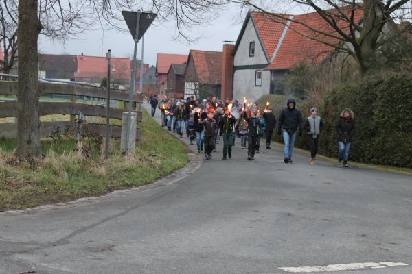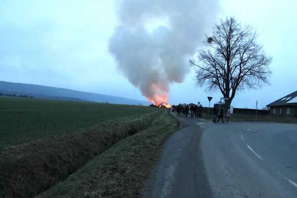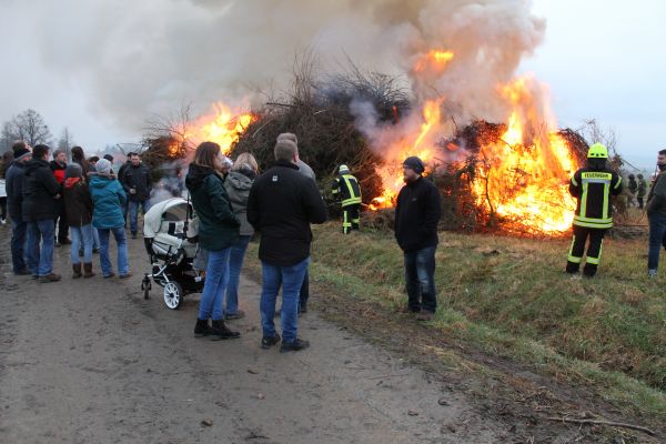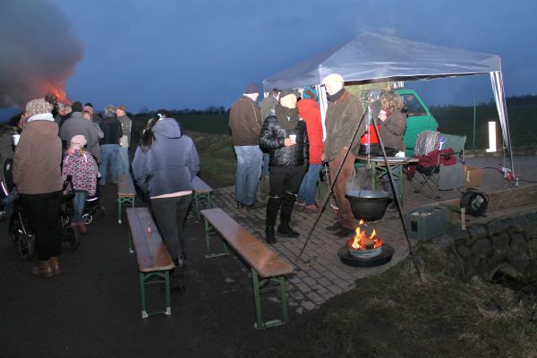 Der Ortsrat hatte alle Kinder und deren Erwachsene Begleiter zu einem Fackelzug vom Feuerwehrhaus zum Osterfeuerplatz für 19 Uhr eingeladen. Die hierfür benötigten Fackeln konnten für 1, – € von dem Ortsrat erworben werden. Dies wurde von den Kindern gut angenommen, so dass sich ein stattlicher Fackelzug ergab. Am Osterfeuer hatte der Ortsrat einen Getränkepavillion aufgebaut, und verkaufte hier neben anderen Getränken auch Glühwein, da es ja wieder recht kalt geworden war. Das Osterfeuer wurde nach Ankunft des Fackelzuges von der Feuerwehr angezündet, und konnte sich nach anfänglichen Schwierigkeiten gut ausbreiten. Einige Kameraden der Feuerwehr übernehmen den Brandschutz und achten darauf dass nichts passiert. Sie schieben immer wieder das Schnittgut vom Rand in das Feuers damit alles verbrennt, so bleibt außer der Asche von dem Feuer kaum etwas übrig. Nach dem Besuch am Osterfeuer, trifft man sich dann noch einmal am Feuerwehrhaus um hier noch Bratwurst, Pommes und die angebotenen Getränke zu erwerben und in gemütlicher Runde zu verzehren.