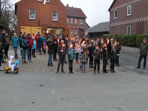 Die Kinder beim Aufstellen zum Fackelzug am Feuerwehrhaus. |