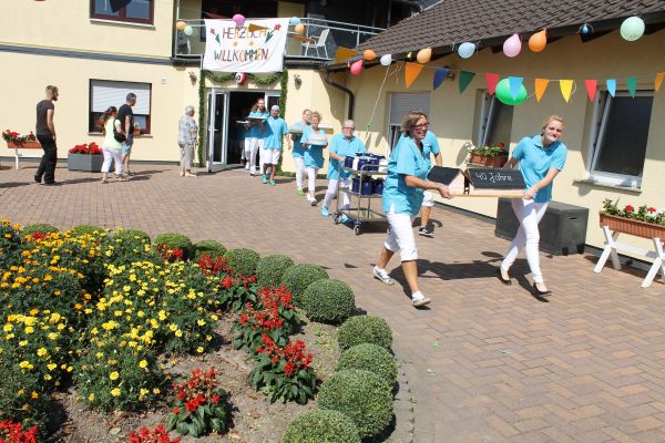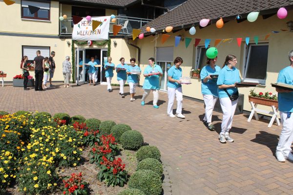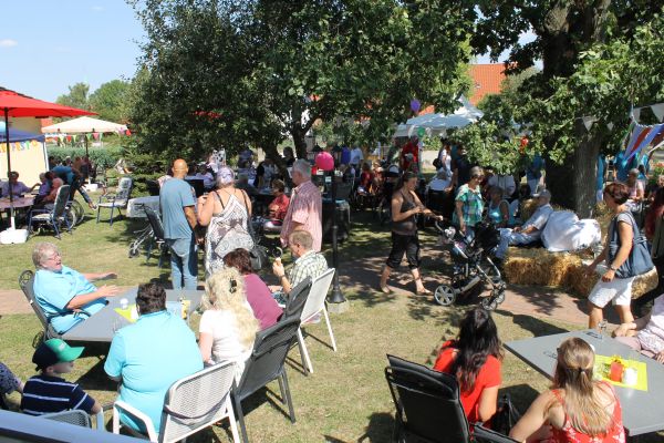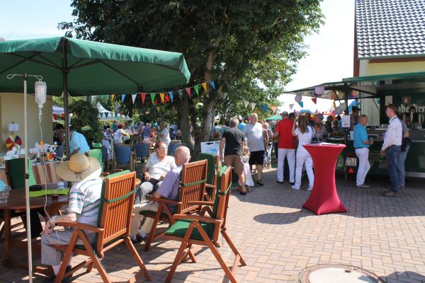 Im Garten konnten sich die Kinder auf 2 Hüpfburgen austoben, für die erwachsenen Besucher waren mehrere Pavillions mit Sitzmöglichkeiten und zusätzlichen Tischen im Garten verteilt aufgebaut. Hier konnten die vielen Besucher auch ein schattiges Plätzchen finden. Ein Getränkestand, ein Verkaufsstand, ein Eiswagen und der Informationswagen der Jägerschaft waren ebenfalls aufgebaut. Ein großes Kuchenbuffet, mit selbstgebackenen Kuchen, wurde von den Angestellten des Hauses in einer Polonaise vom Haus in den Garten gebracht – aufgebaut und anschließend verkauft. Der Kaffee wurde an den Plätzen ausgeschenkt. Ab 16:30 Uhr wurde dann gegrilltes – und Gyros angeboten. Ein Alleinunterhalter sorgte für die musikalische Unterhaltung. Es wurden auch Lose für eine große Tombola mit vielen Preisen verkauft. Der Erlös dieser Veranstaltung soll der DKMS gestiftet werden. So war für das leibliche Wohl und die Unterhaltung reichlich gesorgt.