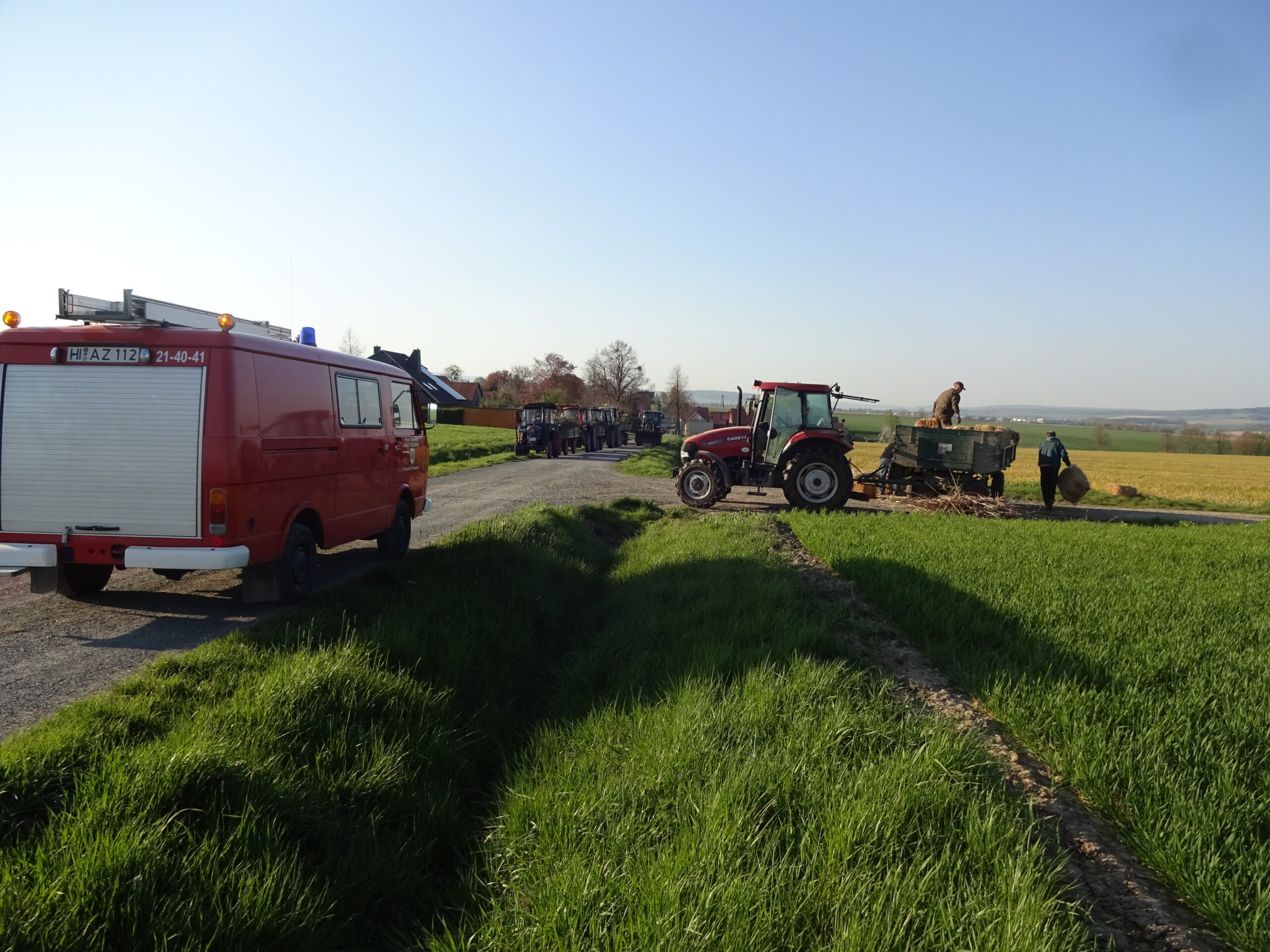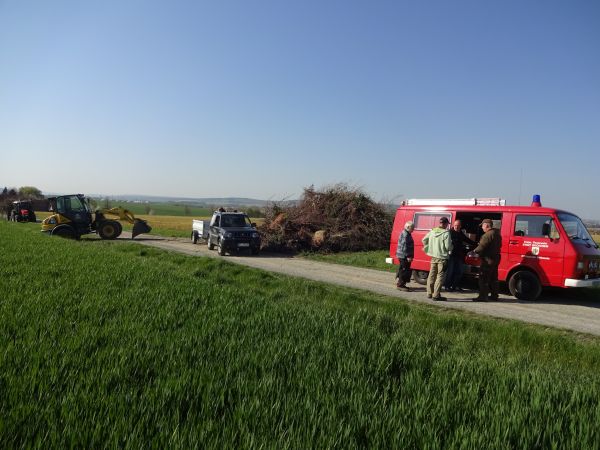 Wie schon seit vielen Jahren üblich, wurde auch in diesem Jahr das Osterfeuer von der Freiwilligen Feuerwehr Schlewecke am Ostersamstagmorgen zusammen gefahren und am Abend abgebrannt. Alle Helfer, und Traktorenfahrer mit ihren Anhängern trafen sich um 8 Uhr am Feuerwehrhaus um den Strauch – und Baumschnitt aus dem Ort und der Feldmark zusammen zu fahren. Aus dem Dorf gab es viele Anmeldungen zur Abholung des Schnittgutes, gegen eine Spende. So herrschte im Ort bei dem Zusammenfahren – und am Ablageplatz für das Feuer ein reger Betrieb. Von 9:30 – 11 Uhr durfte aber auch selbst angeliefert werden. Das Beladen der Anhänger im Ort geschah meist von Hand von den Feuerwehrkameraden, am Ablageplatz wurde das Schnittgut dann mit einem Radlader abgeladen und zusammen geschoben. Durch die vielen Anmeldungen zog sich der Aufbau bis zum frühen Nachmittag hin, es wurde wieder ein großes Osterfeuer. Das Arbeiten machte bei herrlichem Wetter und angenehmen Temperaturen mehr Spaß als im letzten Jahr, wo es ständig regnete. Zum Abschluss trafen sich dann noch einmal alle am Feuerwehrhaus um sich mit Getränken, Bratwurst und Pommes, für die geleistete Arbeit zu Stärken.