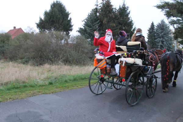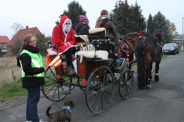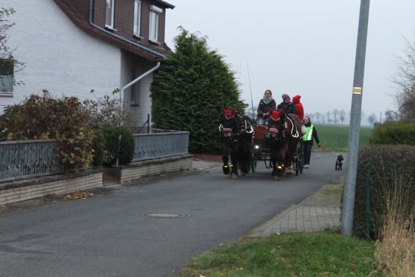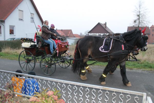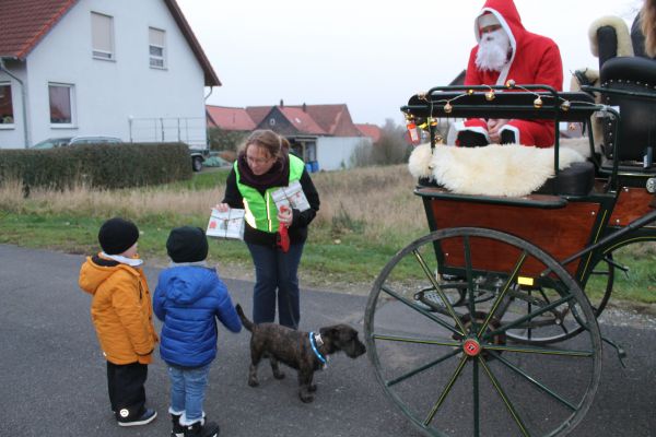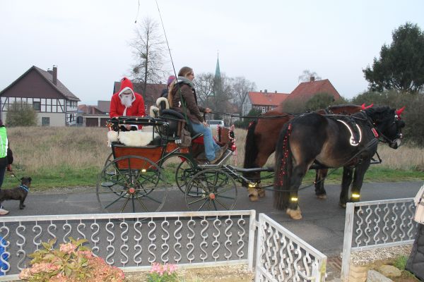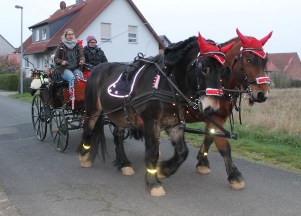 Der Ortsrat lädt schon seit mehreren Jahren die Schlewecker Kleinkinder zu einer Feier mit dem Nikolaus ein. Aber auch dieses Treffen konnte in diesem Jahr durch die Corona Hygienevorschriften in der gewohnten Weise nicht stattfinden. In den letzten Jahren traf man sich dazu an der Kirche oder bei schlechten Witterungsverhältnissen in einer Scheune. Hier kam dann der Nikolaus und hat den Kindern eine Geschichte vorgelesen und ein kleines Geschenk überreicht. In diesem Jahr war das nun so nicht möglich, daher haben sich die Mitglieder des Ortsrates etwas anderes ausgedacht. Der Nikolaus fuhr in einer Kutsche, die von 2 adventlich geschmückten Pferden gezogen wurde, durch den Ort und hat allen Kindern unter 7 Jahren ein kleines Geschenk überreicht. Der Nikolaus war in diesem Jahr das Ortratsmitglied Otto Ohms. Er mußte durch den ganzen Ort fahren, denn es galt mehr als 30 Kinder zu besuchen. Da ja auch hier die Abstandsregelungen eingehalten werden sollten, und der Nikolaus nicht immer von der Kutsche absteigen konnte, hatte er dabei Unterstützung von einer Gehilfin die die kleinen Tüten dann weiterreichte. Das war eine sehr gute Idee und so hatten die jüngsten des Ortes doch noch an diesem Tag ihre Begegnung mit dem Nikolaus. Ein besonderer Dank gilt auch den Besitzern des Pferdegespannes und der Kutsche, die das Gefährt sicher durch den Ort lenkten.