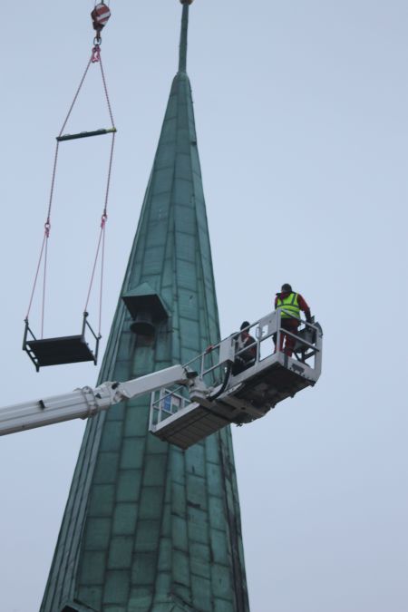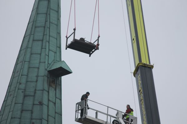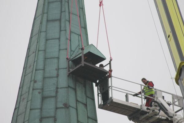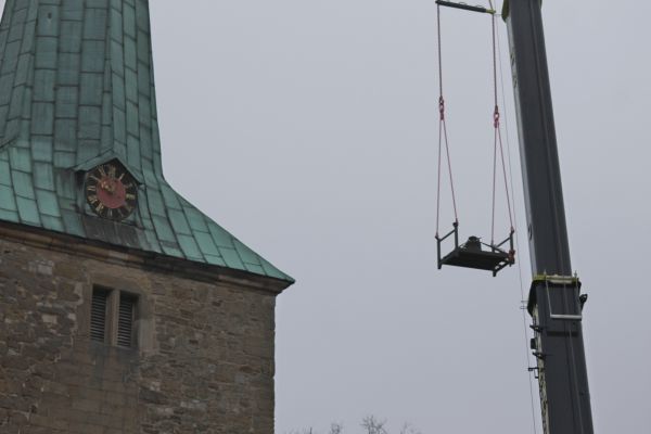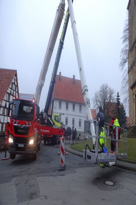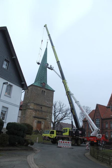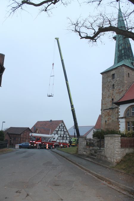 Mit der Koordination der hierfür erforderlichen Maßnahmen wurde die Zimmereifirma Hoffmeister aus Lamspringe beauftragt. Am Mittwoch den 9. Dezember wurde dann gleich nach Tagesanbruch damit begonnen die Glocke vom Turn herunter zu holen. Auf der Straße vor der Kirche wurden hierzu ein Autokran und ein Hubsteiger aufgebaut. Mit dem Autokran wurde eine Palette hoch bis direkt unter die Glocke gefahren, die dann darauf abgestellt werden sollte. Mit dem Hubsteiger ist ein Angestellter der genannten Firma ebenfalls nach oben gefahren. Nun mussten die Glockenhalterungen unter dem Glockendach entfernt werden. Dies erwies sich als schwieriger als vermutet, da sich die Halterung verschoben hatte, und man bei dem Durchtrennen der Eisenbolzen nicht unter das Dach sehen konnte. Aber mit viel Mühe ist es dann doch gelungen und die 250 Kg wiegende Glocke stand durch seitliche Abstützungen fest auf der Palette. So konnte Sie dann sicher herunter gefahren werden. Nun wird die Glocke erst einmal eingelagert, damit nach der Erneuerung des Haltebalkens im nächsten Jahr die Glocke wieder aufgebaut werden kann. Bevor jedoch die Arbeiten im Turm beginnen können, muss der Aufgang oberhalb der Uhr erst einmal von Taubenkot und sonstigen Ablagerungen gereinigt werden. Ohne diese Maßnahme ist eine Erneuerung nicht zumutbar.