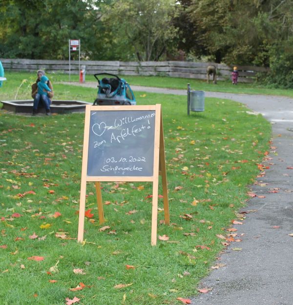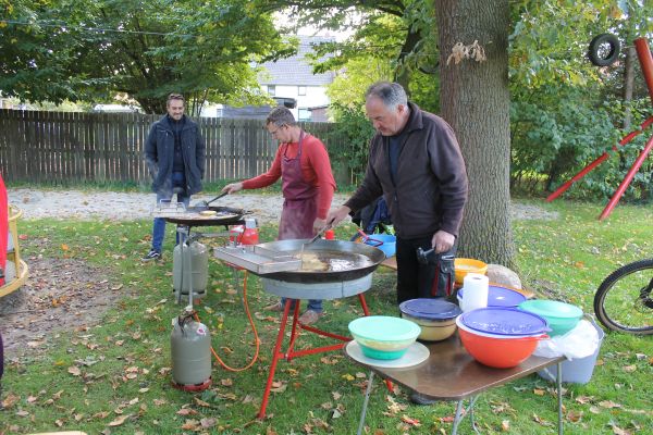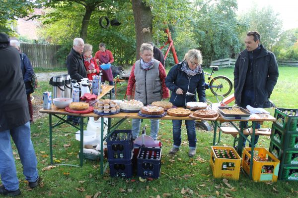 Der Ortsrat hatte am 3. Oktober um 14 Uhr zu einem Apfelfest auf dem Spielplatz in der Teichrinne eingeladen. Da das Dorfgemeinschaftshaus durch den Anbau der Toiletten im Augenblick nicht genutzt werden kann, ist man hierher ausgewichen. Die Ortsbürgermeisterin betonte bei ihrer Begrüßung, dass dieser Ort am Tag der deutschen Einheit ja auch unter der Eiche, die zu der Wiedervereinigung gepflanzt wurde, sehr passend ist. Neben 9 verschiedenen Apfelkuchen konnte auch noch Puffer mit Apfelmus zum Essen erworben werden. Und bei den Getränken gab es Apfelsaft und Apfelschorle. Es wurden aber auch Kaffee und andere kalte Getränke angeboten. Selbstgepresster Apfelsaft, in 5 Liter Behältern, wurde ebenfalls zum Kauf angeboten Die Kuchen und die etwa 25 Kg. Pufferteig haben wie immer Frauen aus dem Ort gespendet. Die Puffer wurden vor Ort in 2 großen Pfannen auf Gasbrennern gebraten. Hier war immer großer Andrang, so dass die beiden Herren an den Bratpfannen kaum nachkommen konnten, denn die Veranstaltung war sehr gut besucht. Erfreulich dabei war das viele Schlewecker Neubürger diese Veranstaltung besuchten. Auch Verwandte oder Bekannte aus anderen Orten waren dabei, und so konnte man sich in Gesprächen kennenlernen. Bei trockenem, aber doch schon kühlerem Wetter, hatten vor allen Dingen auch die Kinder ihren Spaß an den Spielgeräten neben an. Die Kuchen konnten nicht alle verkauft werden, aber bei den Puffern war bis auf einen kleinen Rest alles verzehrt. Und so kann der Ortsrat mit diesem Event wieder zufrieden sein.