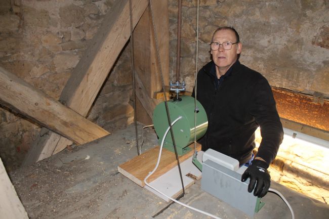 Die Kirchenuhr, und somit auch die Schlagglocke, ist seit Anfang April defekt. Da beim wöchentlichen Aufziehen der Gewichte das Seil für die Uhr übergesprungen war (Wie bereits am 12.7 berichtet). Bei dem Versuch das Seil, durch die Firma Rincker aus Sinn, wieder aufzulegen wurde festgestellt, dass beide Seile beschädigt sind und ausgetauscht werden müssen. Weiterhin hat sich das abgesprungene Seil in der Mechanik der Uhr verklemmt und kann ohne eine größere Reparatur nicht ausgetauscht werden. Dies wurde von der Firma der Pfarrerin auch so mitgeteilt. Daraufhin mußte ein Kostenvoranschlag zur Reparatur dieser Fehler und auch zur Elektrifizierung der Uhr und vom Schlagwerk erstellt werden. Da das Angebot der unterschiedlichen Ausführungen keine große Differenz betrug, beschloß der Kirchenvorstand die Uhr und das Schlagwerk elektrisch auszurüsten. Dies wurde nun durch einen Monteur der Firma am 13.11.24. umgesetzt. Es wurde je ein Motor für die Uhr und das Schlagwerk auf dem Dach vom Schrank der mechanischen Uhr aufgebaut, und mit der alten Übertragung zur Uhr und dem Schlagwerk verbunden. Im Kircheneingang ist eine neue moderne digitale Schaltuhr installiert, die jetzt auch über einen längeren Zeitraum programmiert werden kann. Die Alte Zeitschaltuhr wurde abgeklemmt, und auch das mechanische Laufwerk der Firma Weule aus Bockenem von 1918 wird jetzt nicht mehr benötigt. Weiterhin Entfällt damit die jährliche Wartung des Laufwerkes und das wöchentliche Aufziehen der beiden Gewichte. Nun erklingt die Schlagglocke wieder zur halben – und zur vollen Stunde, wie bisher auch, aber nur noch von 6 Uhr bis 22 Uhr, dies ist die Werksgrundeinstellung. Nun wollen wir hoffen das es nicht so schnell wieder zu Störungen kommt.