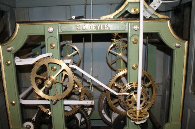 ![]() | Der Monteur, Herr Junge, vor den beiden neuen Motoren. Der grüne für die Uhr und der weiße für die Schlaguhr. |