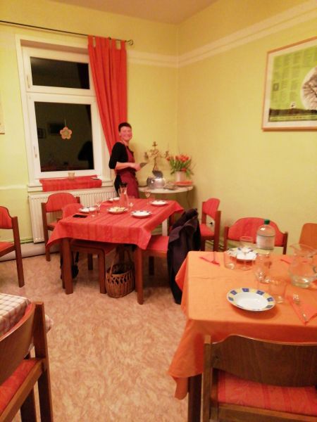 ![]() | Frau Enrica Agostinetto bei den Vorbereitungen hinter den gedeckten Tischen. |