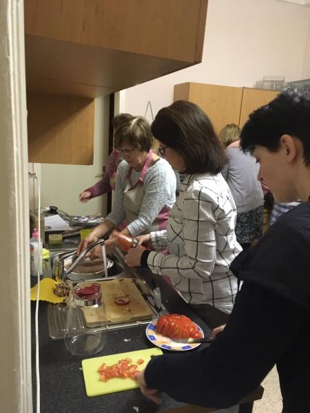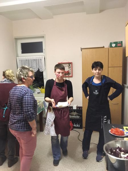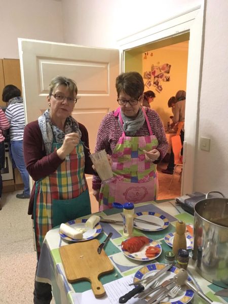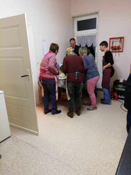 Am Mittwoch den 3. Februar hatte der Frauenkreis Schlewecke zu einem „Italienischen Abend“ in das Pfarrhaus eingeladen. Frau Enrica Agostinetto aus Schlewecke, die in Italien geboren und auch noch bis zu ihrer Heirat lebte, hat diesen Abend gestaltet. Mit den 15 Teilnehmern, 14 Frauen und einem Mann, wurden landestypische Gerichte gekocht. Bei der Zubereitung der Speisen wurden in mehreren Gruppen alle anwesenden eingebunden, und es herrschte in der kleinen Küche ein sehr emsiges Treiben. Für die vielen verschiedenen Gerichte war der vorhandene Herd, mit seinen 4 Kochplatten, eigentlich zu klein so dass kräftig improvisiert werden musste. Es wurden die folgenden Speisen zubereitet: