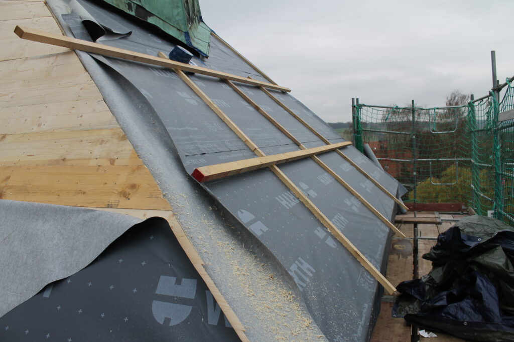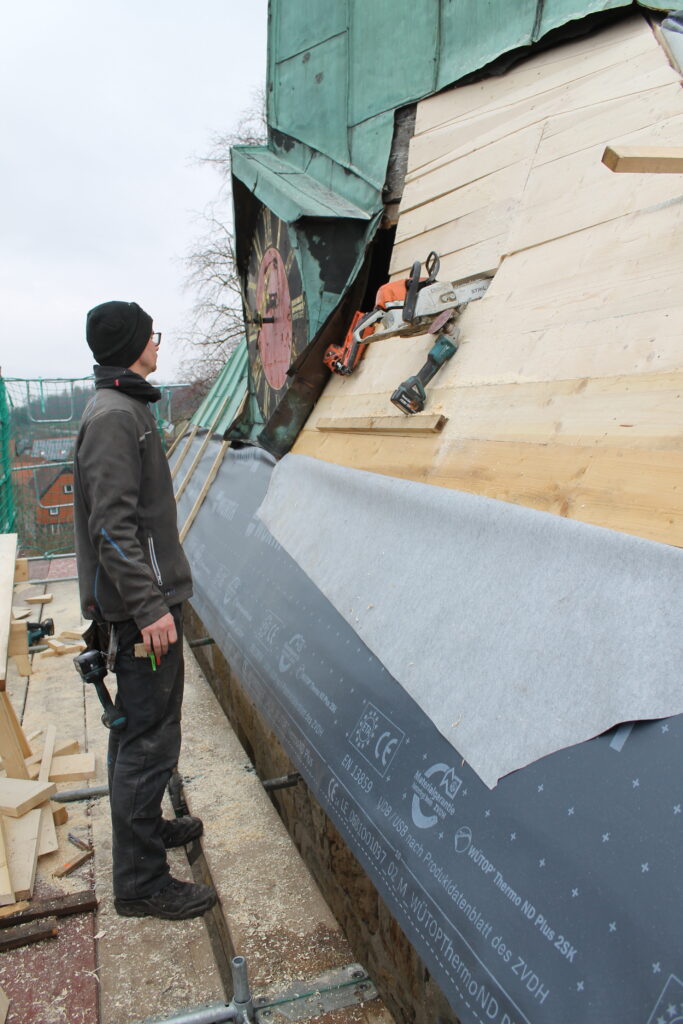 Auf der Westseite wurden die Kupferplatten und die Verschalung nur im unteren Bereich ganz – und links neben der Uhr aber die gesamte Schräge abgenommen, da hier die Unterverschalung sehr stark verwittert war. 1. Auflagebalken für die Schalung mußte auch hier wegen Witterungsschäden erneuert werden. Für die anderen Balken wurden nur die unteren kurzen Auflagen ersetzt. Mit 4 cm. starken Brettern wurden die Schrägen wieder geschlossen. Die Bretter müssen so stark sein, um darauf anschließend die Schieferplatten nageln zu können. Dünnere Bretter würden federn und die Schieferplatten nicht festsitzen. Auf die Bretter kam dann eine spezielle Abdeckfolie die zum Verschiefern benutzt wird, und mit Dachlatten befestigt wurde. Durch diese Folie ist das Dach nun geschlossen und kann über den Winter so vor dem Wetter schützen bevor dann voraussichtlich im nächsten Frühjahr- Sommer die Arbeiten mit dem Verschiefern abgeschlossen werden können. Die Traufe an der Südseite wurde als letztes noch angebracht. Über den Winter ist somit das Dach erst einmal Wetterfest, und das Gerüst wird erst einmal wieder abgebaut.