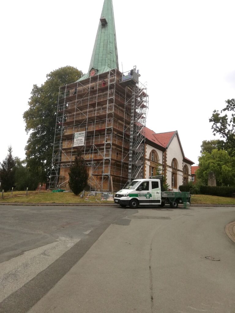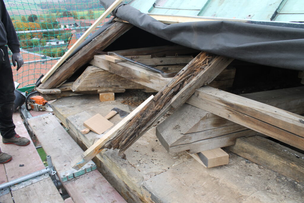 Beim Aufhängen der Glocke im August 2023 wurde festgestellt, dass die vorgesehene Erneuerung der Traufen zur Südseite nicht durchgeführt werden konnte, da die Balken der Unterkonstruktion hierfür teilweise stark verrottet sind. Bei einer weiteren Begutachtung des Turmes von Fachleuten wurden auch noch weitere Schäden in der Holzkonstruktion festgestellt. Die Mauerauflagebalken für das Turmgebälk sind im Laufe der Jahre ebenfalls auf dieser Seite teilweise verwittert und haben sich bereits um etwa 2 cm. verjüngt, dadurch hat sich der Turm an der Spitze zur Südseite etwas geneigt. Nun hat eine Zimmereifirma aus Northeim den Auftrag bekommen die schadhaften Balken für die Auflagen auf dem Mauerwerk und für die Traufen Befestigung auszutauschen. Hierfür wurde bereits am 10. September an der Süd – und Westseite ein Gerüst aufgebaut. Die Kupferplatten wurden an der unteren Schräge vom Turm auf den beiden Seiten von den Zimmerleuten entfernt. Hierbei traten noch weitere Schäden an den Balken auf, die durch undichte Stellen an den Kupferplatten, diese sind durch fehlerhafte Reparaturen in früherer Zeit, entstanden. Die neuerlichen Schäden wurden von je einem Mitarbeiter der Landeskirche in Wolfenbüttel und der Propstei in Seesen bei einem Termin vor Ort aufgenommen. Dafür muß die Verschalung unter den Kupferplatten, und eventuell auch schadhafte Balken mit erneuert werden. Im Anschluß soll dann der Turm voraussichtlich mit Schiefer neu eingedeckt werden. Der Turm war bereits einmal mit Schieferplatten bedeckt, die 1932 durch die heute noch bestehenden Kupferabdeckungen ersetzt wurden. Nun muß über das weitere Vorgehen und über die Finanzierung entschieden werden.