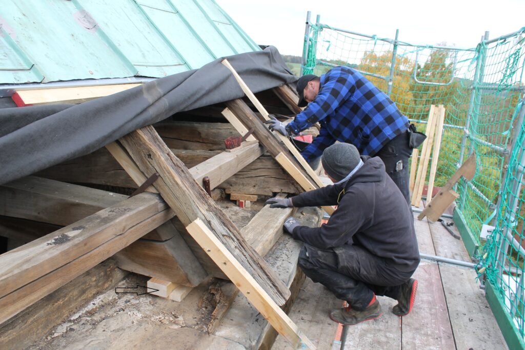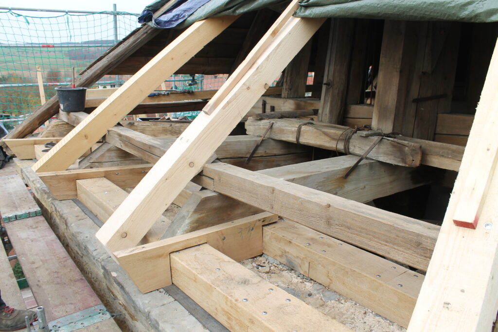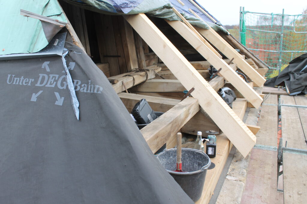 Beim Aufhängen der Glocke im August 2023 wurde festgestellt, dass die vorgesehene Erneuerung der Traufen zur Südseite nicht durchgeführt werden konnte, da die Balken der Unterkonstruktion hierfür teilweise stark verrottet sind. Bei einer weiteren Begutachtung des Turmes von Fachleuten wurden auch noch weitere Schäden in der Holzkonstruktion festgestellt. Die Mauerauflagebalken für das Turmgebälk sind im Laufe der Jahre ebenfalls auf dieser Seite teilweise verwittert und haben sich bereits um etwa 2 cm. verjüngt, dadurch hat sich der Turm an der Spitze zur Südseite etwas geneigt. Nun hat eine Zimmereifirma aus Northeim den Auftrag bekommen die schadhaften Balken für die Auflagen auf dem Mauerwerk und für die Traufen Befestigung auszutauschen. Hierfür wurde bereits am 10. September an der Süd – und Westseite ein Gerüst aufgebaut. Die Kupferplatten wurden an der unteren Schräge vom Turm auf den beiden Seiten von den Zimmerleuten entfernt. Hierbei traten noch weitere Schäden an den Balken auf, die durch undichte Stellen an den Kupferplatten, diese sind durch fehlerhafte Reparaturen in früherer Zeit, entstanden. Die neuerlichen Schäden wurden von je einem Mitarbeiter der Landeskirche in Wolfenbüttel und der Propstei in Seesen bei einem Termin vor Ort aufgenommen. Dafür muß die Verschalung unter den Kupferplatten, und eventuell auch schadhafte Balken mit erneuert werden. Im Anschluß soll dann der Turm voraussichtlich mit Schiefer neu eingedeckt werden. Der Turm war bereits einmal mit Schieferplatten bedeckt, die 1932 durch die heute noch bestehenden Kupferabdeckungen ersetzt wurden. Nun muß über das weitere Vorgehen und über die Finanzierung entschieden werden. Zum Austauschen der 2 Mauerauflagebalken wurden die Turmtragebalken einzelnen mit 2 Hartholzkeilen gegeneinander getrieben und so etwas angehoben um die Teilstücke des gesamten Balkens zu entfernen. Die neuen Eichenbalken wurden ebenfalls in Teilstücken, die an den Enden jeweils überlappen und mit Schrauben verbunden werden, wieder eingefügt.