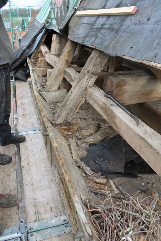Die verrotteten Balken der Traufe und der Mauerauflagebalken.