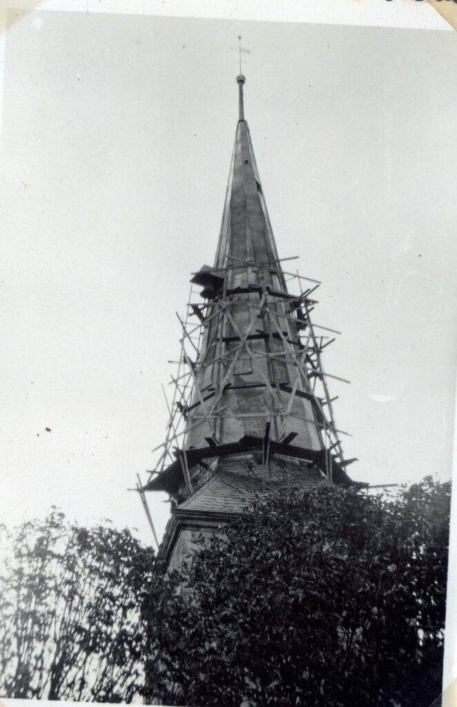 Der Kirchturm wird 1932 neu gedeckt. Unten sieht man noch die Schieferabdeckung.